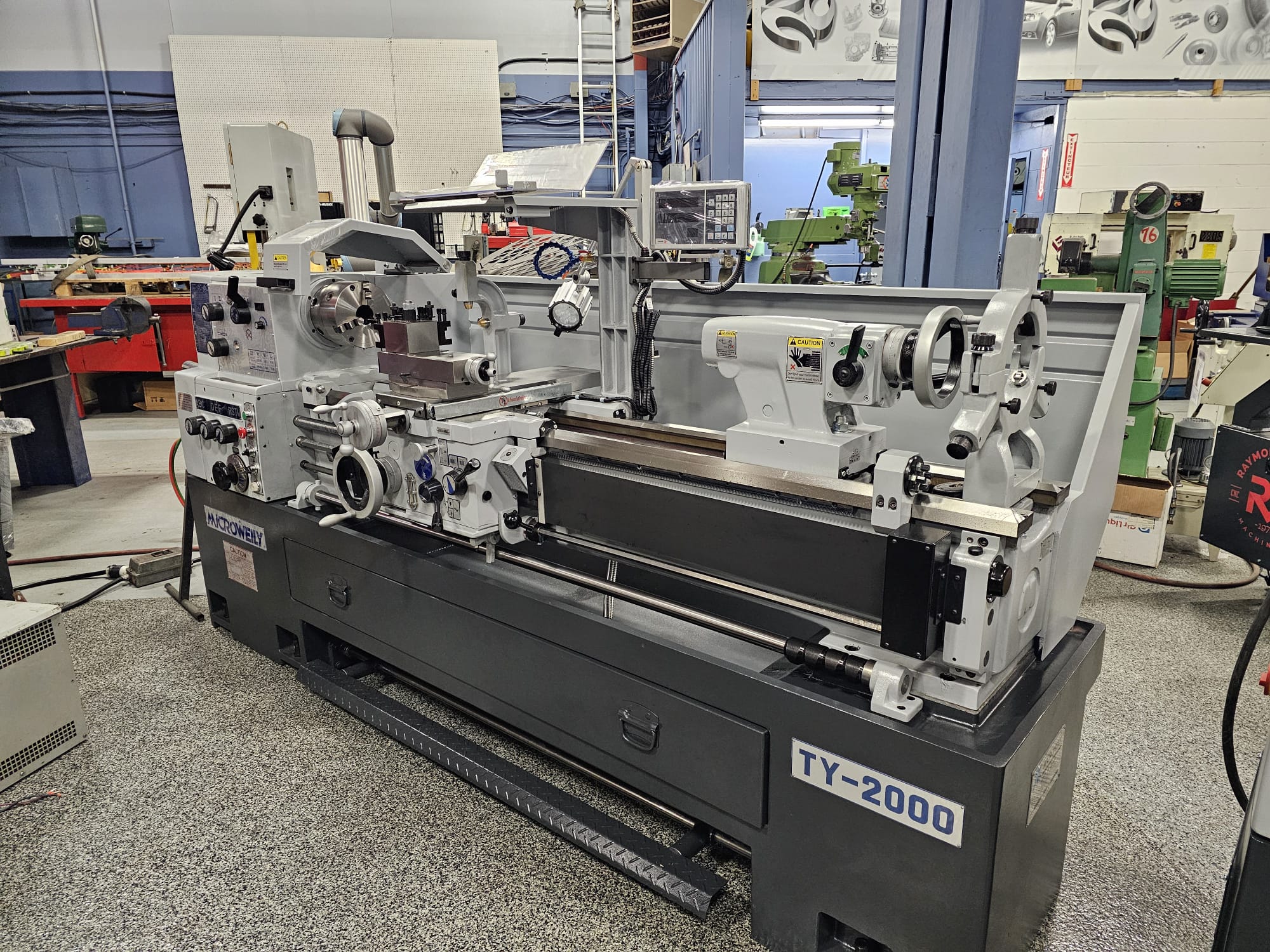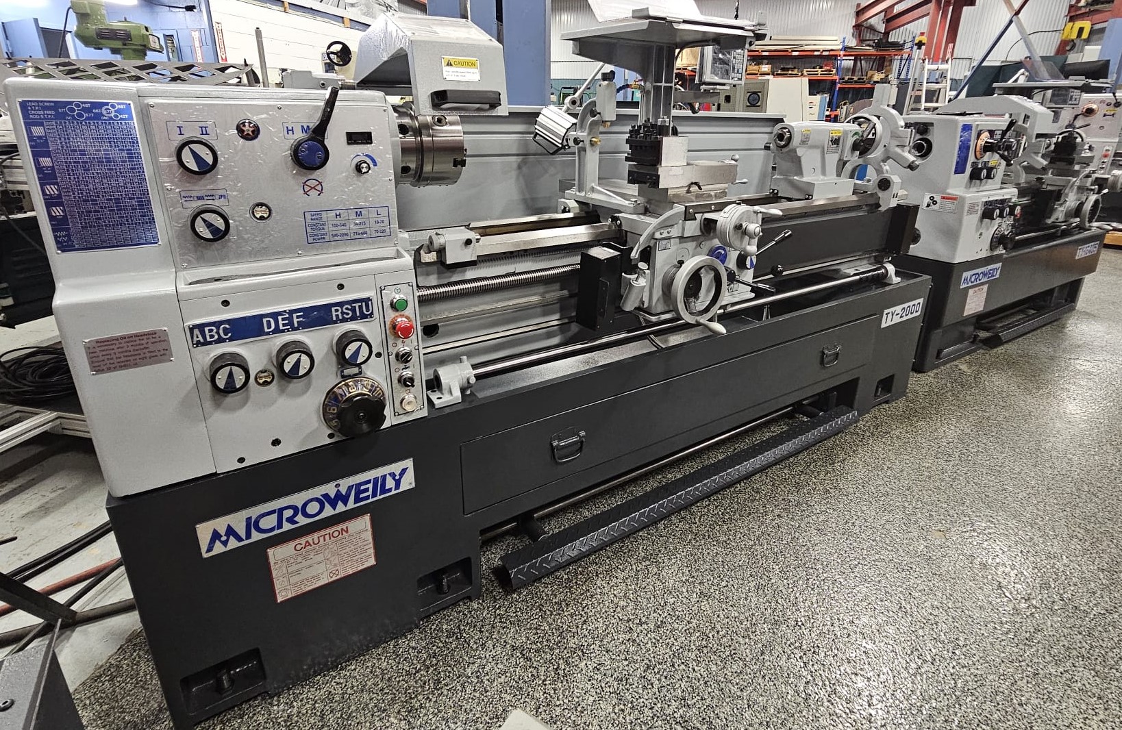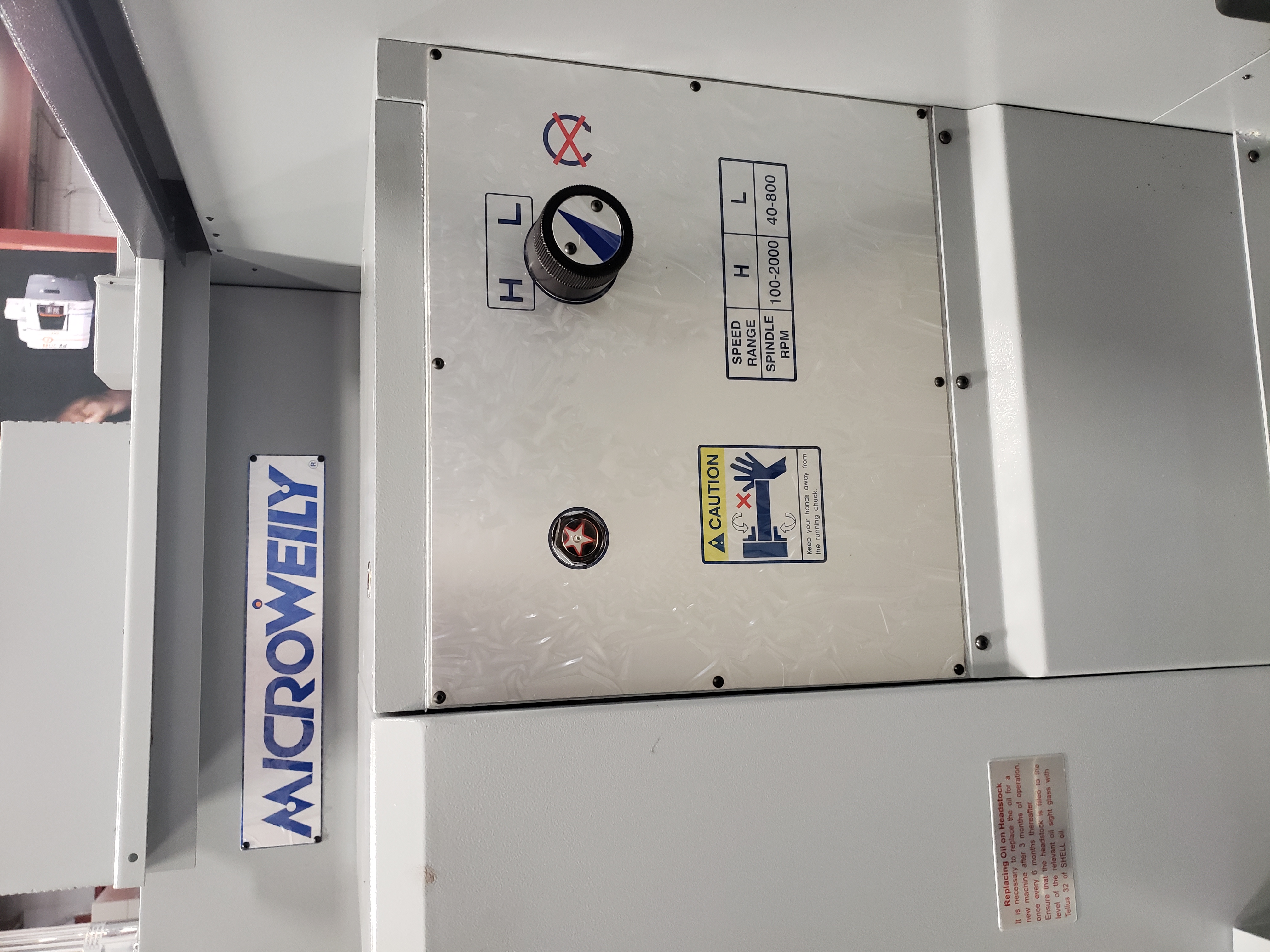 Tour Horizontal Microweily TY-2000VS (variable speed lathe) Passage au dessus banc 18" Passage au dessus chariot 11-1/3" Passage au dessus banc rompu 25-3/16" x 6-1/8" long Distance entre centre 63" Largeur du banc 11-13/16" Diamètre tube broche 2-5/16" Nez de broche D1-6 3 steps vitesse variable Dimensions: 116" x 43" x 49" Poids: 2000kgs Moteur de 10HP, 220V 3ph Tranfo 575V - 220V Mandrin taiwanais 8" 3 mors avec backplate Mandrin taiwanais 10" 4 mors Système de coolant Steady rest (bearing shaft, 1"-6") Lampe de travail LED Follow rest Garde arrière Garde mandrin avec micro switch Protecteur de visse mère Pointe Mt4